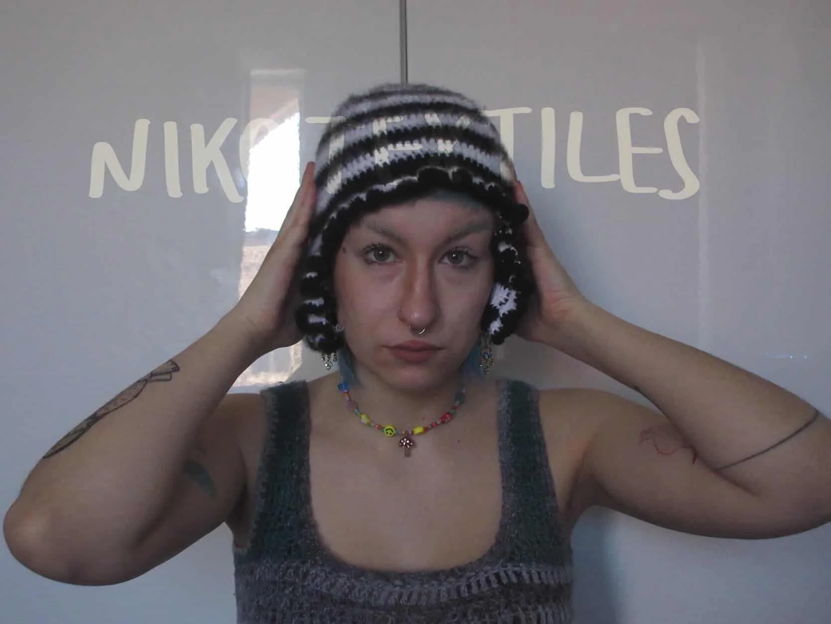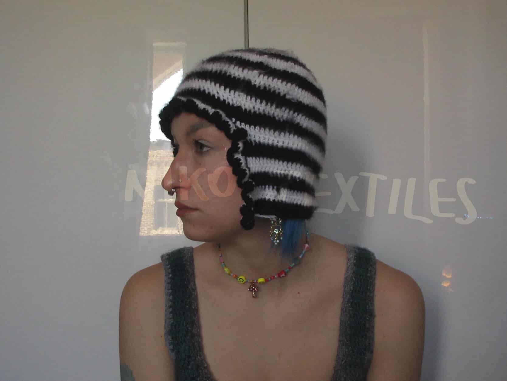 Shop › Striped Hat Image 1 of 2 Image 2 of 2 Striped Hat CA$50.00 Made with black and white wool, with a ruffled trim. Crocheted by hand. Brushed for that fuzzy feeling. Add To Cart Added! Made with black and white wool, with a ruffled trim. Crocheted by hand. Brushed for that fuzzy feeling.
